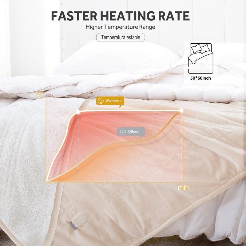 Warmrest Heated Blanket Electric Throw Soft Flannel Sherpa, 6 Heat Levels Fast Heating, 2 to 10 Hours Auto-Off Detachable Controller Machine Washable, Beige 50"x60"