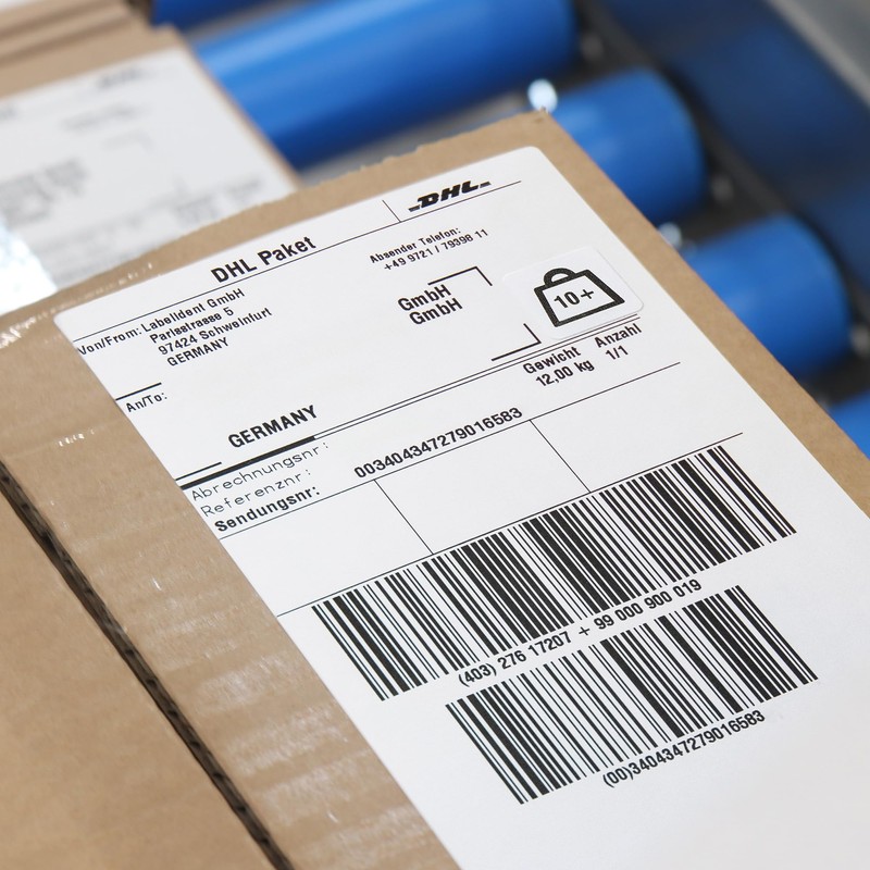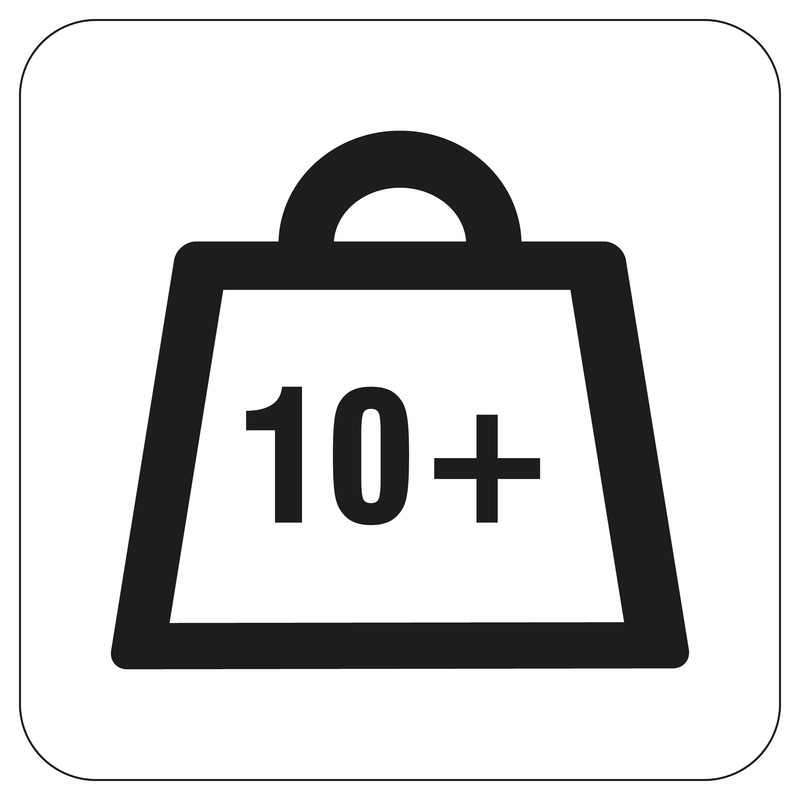 • Parcel sticker (black and white) self-adhesive with printed text: 10+; pictogram: weight with kg indication; shipments over 10 kg to 20 kg