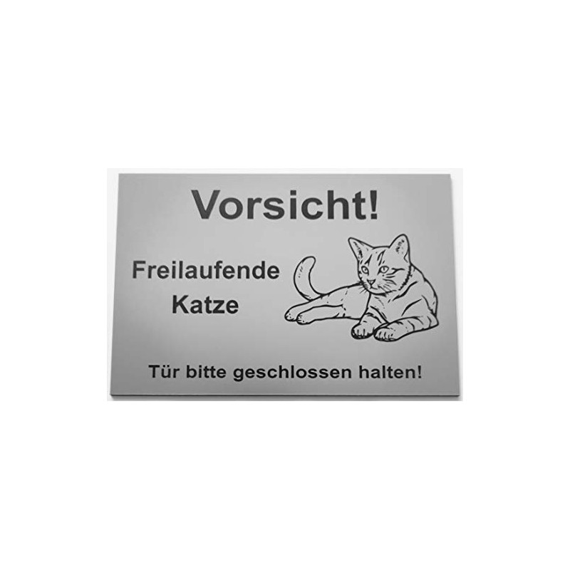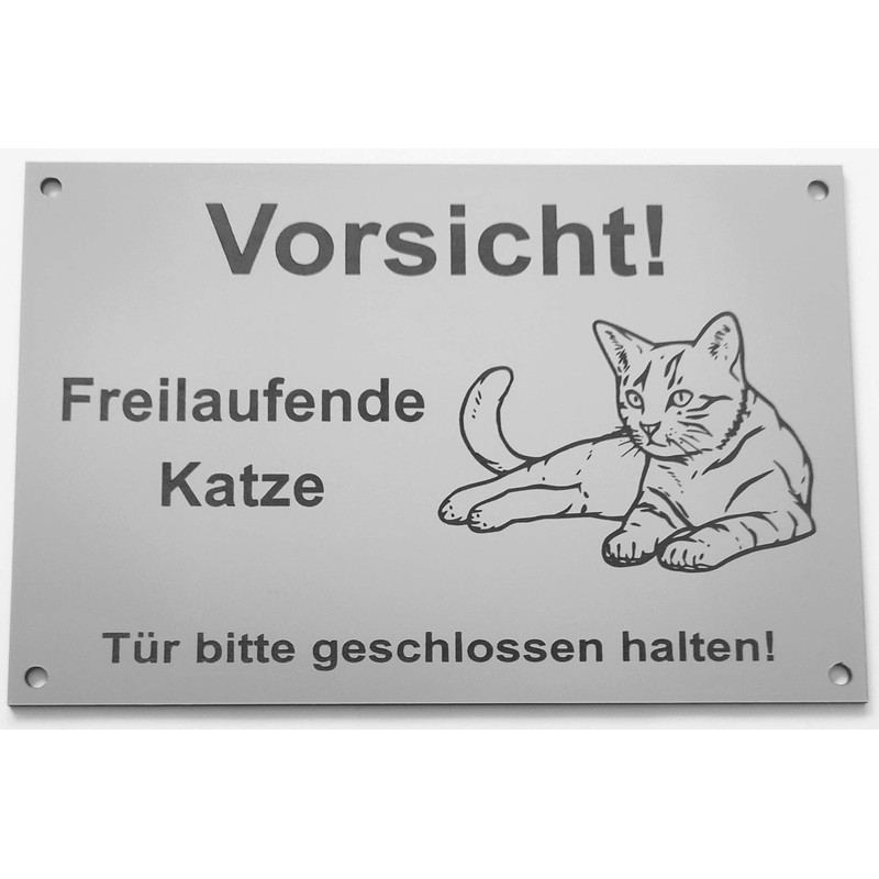 Warning Sign, Caution Freilaufende Katze, Keep Door Closed, Sign, Cat Sign, Lying Down Silver (15 x 10 cm, 4 Holes Corner)