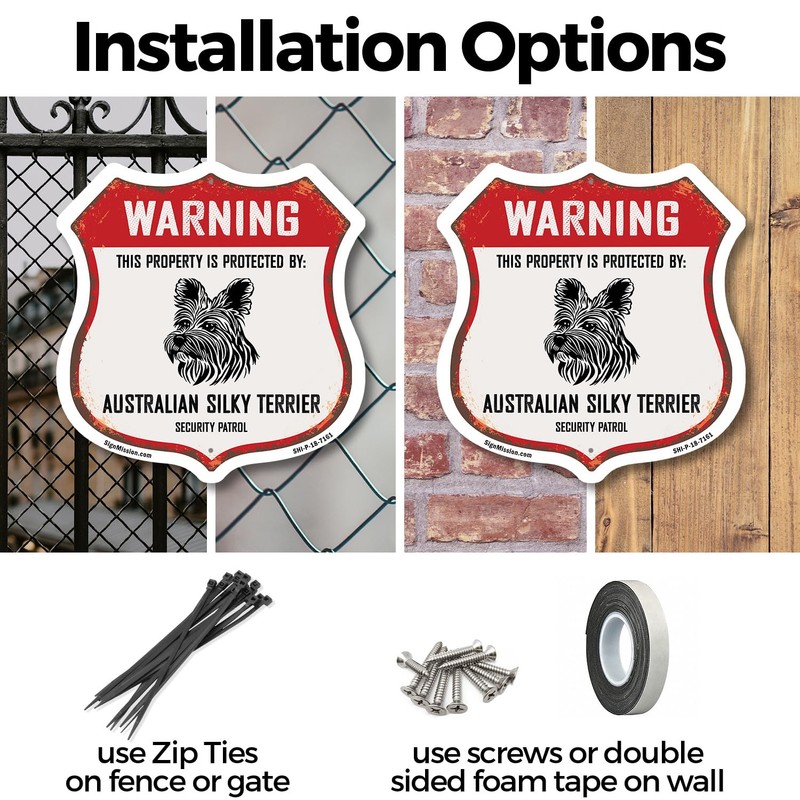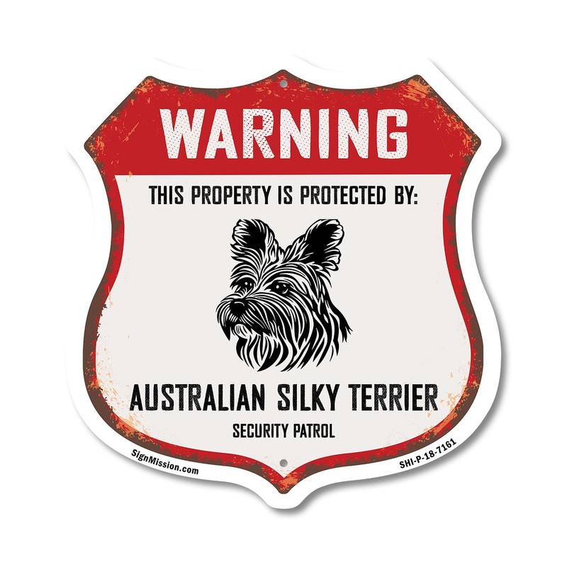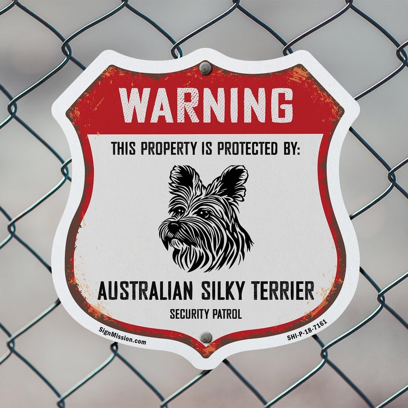 - WARNING: This Property is Protected by Australian Silky Terrier — Elegant, alert, and impossible to ignore. Our bold, high-visibility signs ensure everyone knows your loyal Australian Silky Terrier are on duty. Designed to grab attention from a distance, these signs deliver a clear message: approach with caution—there’s beauty and watchdog instinct here.