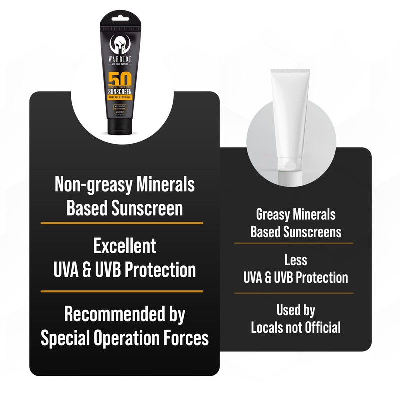 - HIGH-PROTECTION MINERAL FORMULA: Warrior’s sunscreen lotion is crafted with 4.5% Non-Nano Titanium Dioxide and 4% Zinc Oxide. Our SPF 50 lotion creates a gentle, physical barrier against harmful UVA and UVB rays, blocking 98% of UVB rays and keeping your skin naturally safe and healthy.