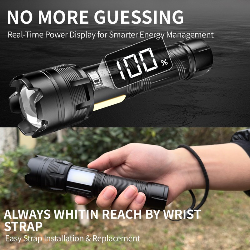 - Durable & Portable: Built with tough materials, this zoomable flashlight is both durable and lightweight. Its adjustable beam allows you to switch between floodlight and spotlight, while the tail rope ensures easy carrying during outdoor adventures.