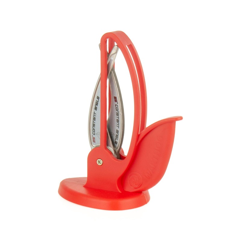 The unique curve in the Diamond Rods maintains a 25 degree angle throughout the entire blade. Spring loaded Diamond Rods keep equal pressure on each side while pulling the blade through. Black finish heavy duty steel frame with rubber non-slip base. Ideal for chefs, hunters, fisherman, or household use. Quick and easy to use. Includes instructional DVD. Color: Red