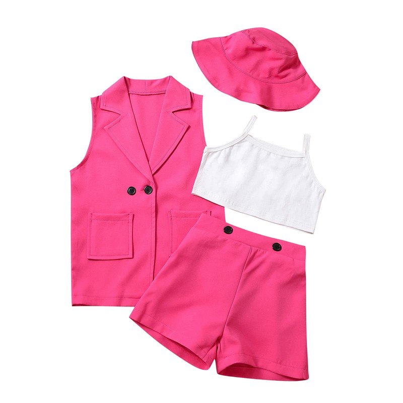 WASAIGOOD Toddler Girls Blazer Set 4 Pcs Cropped Camisole Buttons Shorts Lapel Vests Coat Hats Summer Outfits Set (Pink,2-3 Years)
