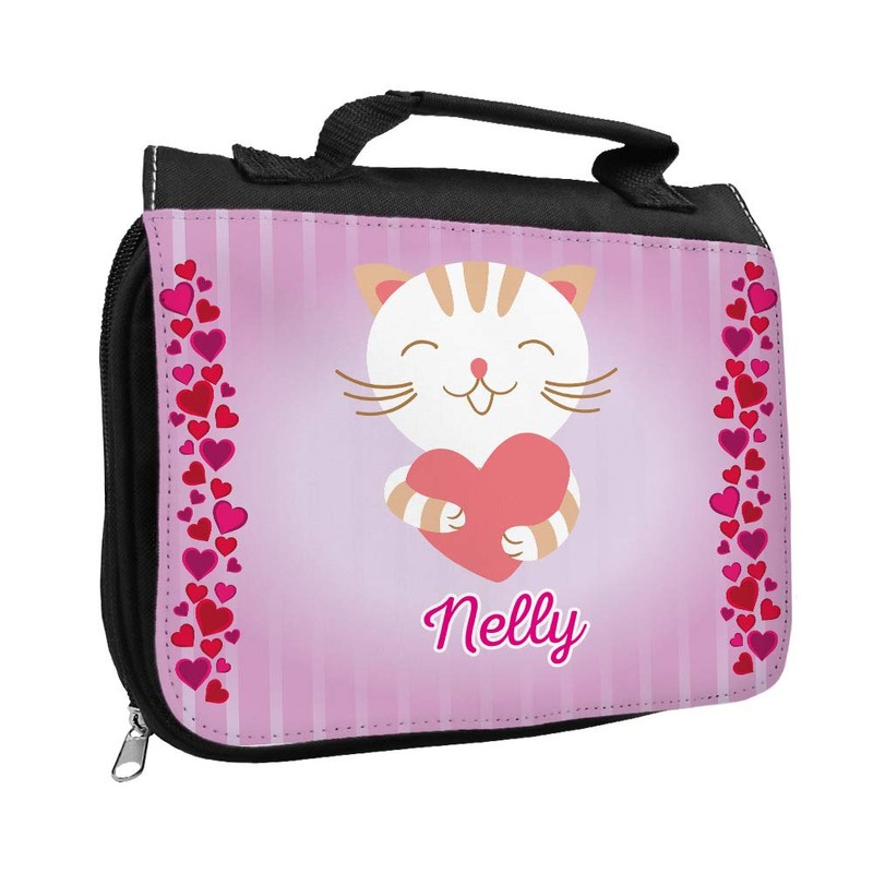 Wash Bag with Name Nelly and Cat Motif with Hearts for Girls Toiletry Bag with First Name Wash Bag for Children