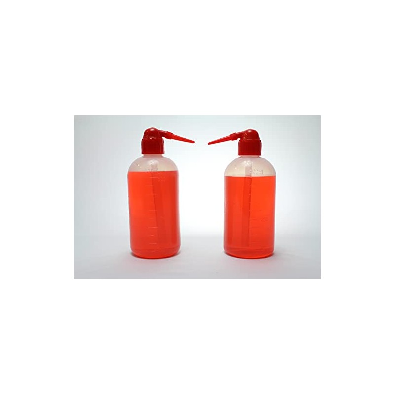 - This chemical-resistant bottle is transparent white and comes with a red cap. This package includes two 500 ml wash bottles.