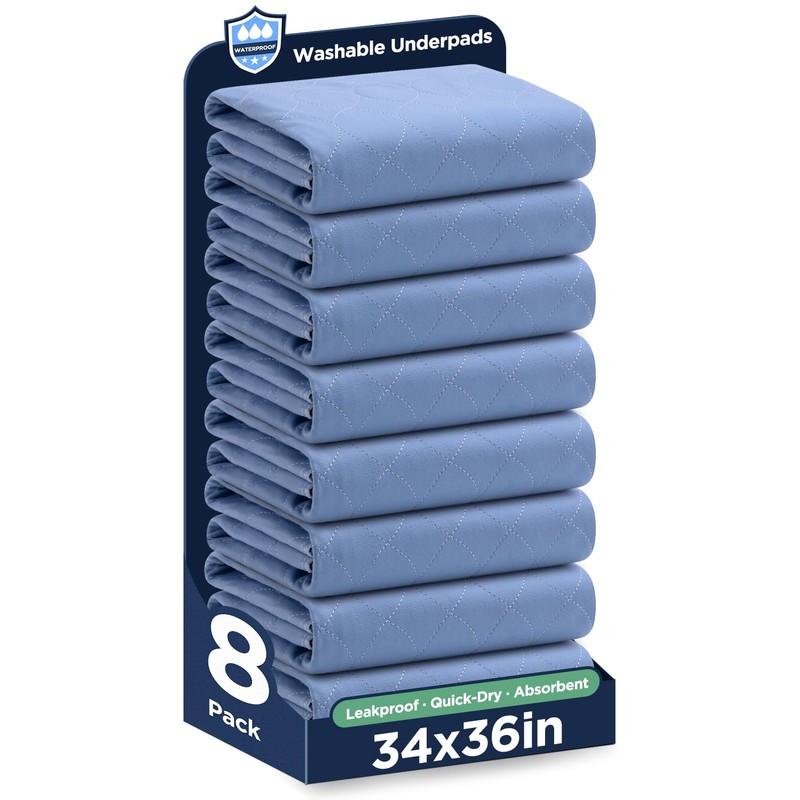 Washable Bed Pads 34" x 36" - 8 Pack, Blue, Waterproof Bed Pads for Incontinence, Bed Wetting Pads for Bed, Sofa, Floor, Resuable Underpads for Adults, Seniors, Pet