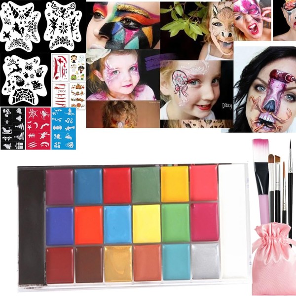 Washable Face Body Painting Kit for Kids and Adults, Professional White Blue Red Green Black Face Paint Makeup Set with Stencils Soft Makeup Brushes and Sticker (20COLOR)