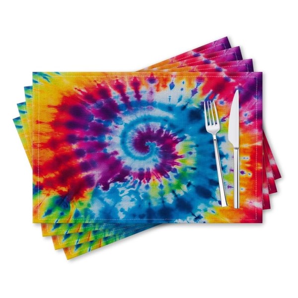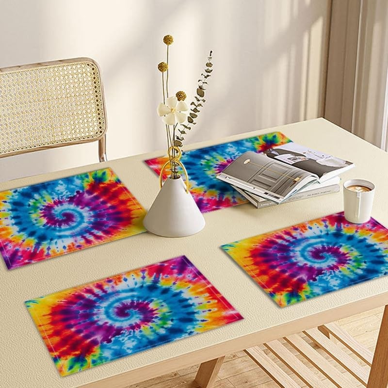 Washable Placemats Set of 4 for Dining Table, Tie - Dye Design in Rainbow - Like Spiral Design on 12x18 Inch Cotton Linen, Easy-to-Clean Table Mats for Kitchen Decor
