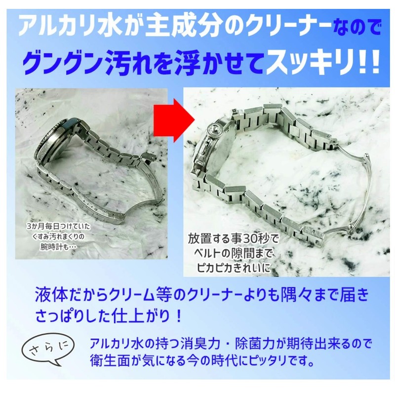 - As the name suggests, "Washed Watch" is a water that cleans up dirt and grime from watch straps and accessories. Watches and accessories that you normally use are hot bed for bacteria due to sweat in summer and sebum stains that are most commonly produced in winter. You can leave it alone and you will smell it. This "washing clock" removes such stains and odors in an instant. Because it is water, it can enter areas that cannot be reached by cream or cloth to remove dirt. Easy to use. Lay tissue or cloth underneath and scrub it and wipe it thoroughly after 20-30 seconds. The straight black sebum stains will take off nicely to the shape of the belt groove. Can be cleaned, deodorized, and disinfected with concentration. For watches, the amount of watches is about 0.2 fl oz (5 ml), so it can be washed around 100 times with a single watch. Please be aware that if you wipe it thoroughly after use, it may cause stains that have not been wiped off on your skin or clothing