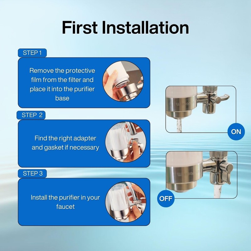 - IMPORTANT: Before installing the purifier on the faucet, unscrew the transparent housing, carefully remove the filter, and take off the protective plastic. Then, place the filter back into the steel base, gently press it down, and screw the transparent housing back on. Turn on the faucet and let water run through the filter for 30 seconds. Done! You can now enjoy clean and purified water