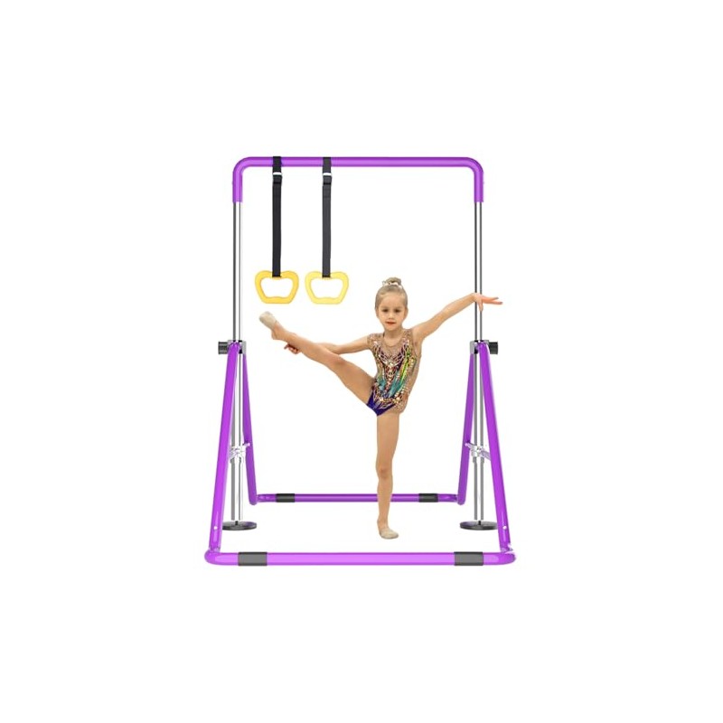 WATBKHE Gymnastic Bars for Kids, Horizontal Bars with Adjustable Height, Folding Gymnastic Training Kip Bar with Rings, Expandable Bars for Boys and Girls, Gymnastic Training Equipment for Home-purple