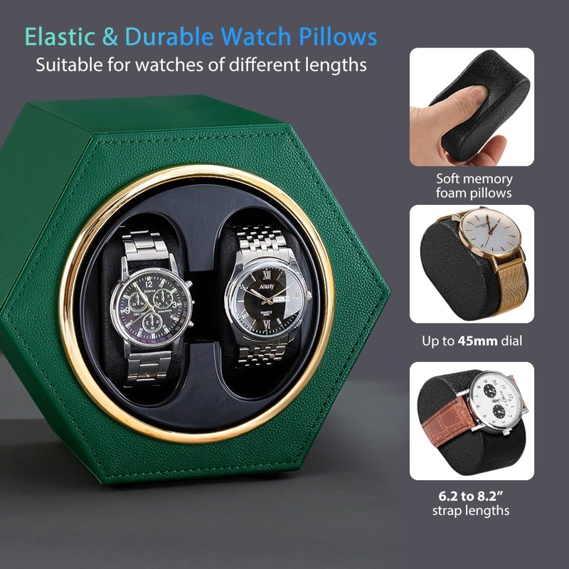 • 【Double Watch Winder】This premium watch winder features a sleek hexagonal shape, offering space for two automatic watches simultaneously. Its modern design blends seamlessly with home or office decor while keeping your timepieces securely stored and ready to wear.With its elegant design, it makes a great gift for any watch enthusiast.