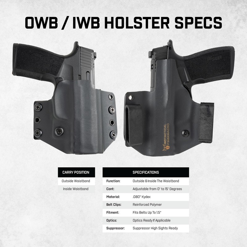- [Reversible Design for Outside OWB or Inside Waistband (IWB) Carry] Our Watchdog Tactical OWB holster easily switches from outside to inside the waistband by removing the screws and relocating the belt clips. This feature provides versatile carry options without sacrificing performance or comfort.