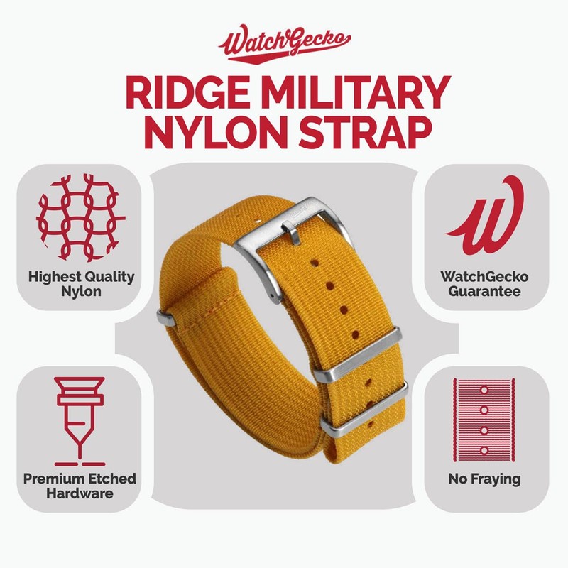 WatchGecko Ridge Military Nylon Watch Strap. Nylon Mens Replacement Watch Strap. Rugged, Quick-Drying and Secure Wristwatch Strap for Outdoor Activities. Yellow, 22 mm