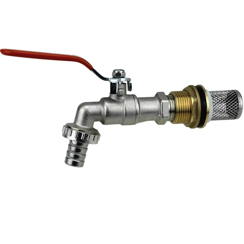 - Solid ball valve made of high-quality brass for the water butt comes with barrel screw connection including seals, hose connection for screwing on the tap and PTFE sealing tape.