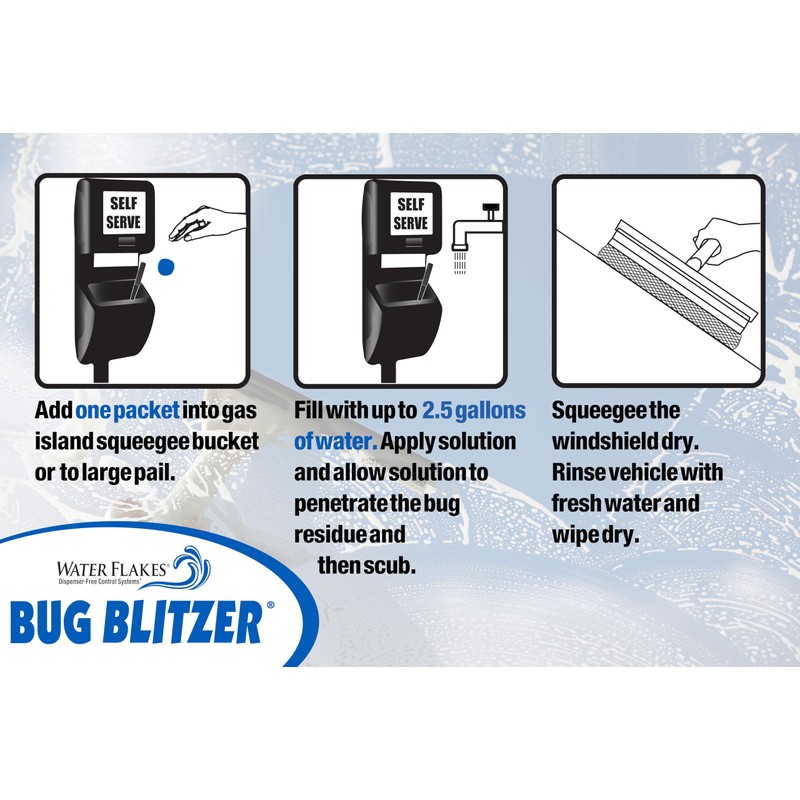 This concentrated glass and windshield cleaner for gas island squeegee buckets cuts bug residue and road film from windshields. Leaves car and truck windshields shining! Also, a great car wash product. #2707995 - 90 x 0.5 wt. oz. per pail. One water-soluble packet makes 2.5 gallons.