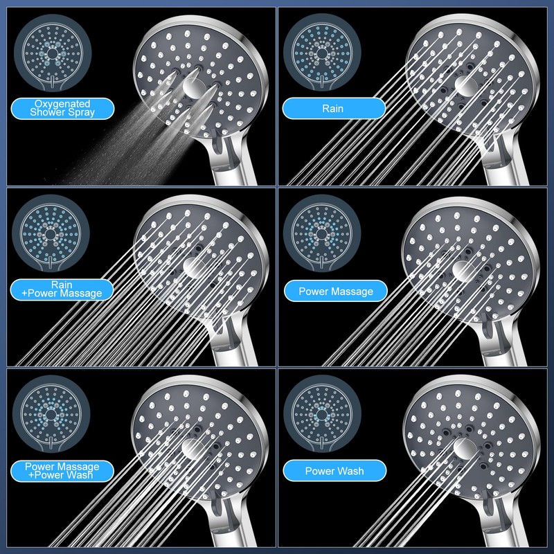 - This hand shower head has six different spray modes that can be easily switched at the touch of a button to meet your different shower needs. Each mode provides a unique shower experience.