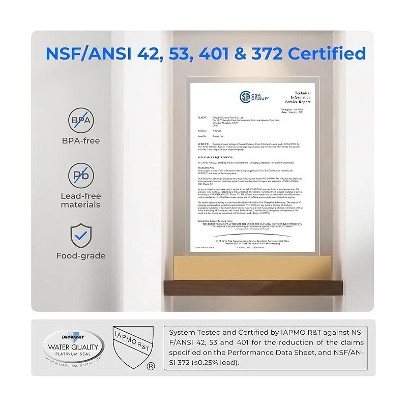 - [NSF/ANSI 42, 53, 401 & 372 Certified] The Compact electric water filter pitcher has been certified by IAPMO against NSF/ANSI 42, 53, 401 & 372 standards to reduce 30+ substances including chlorine, lead, mercury, benzene, bisphenol A and more. The electric water filter has been tested by a third-party lab to reduce PFOA, PFOS, ensuring high-quality drinking water.