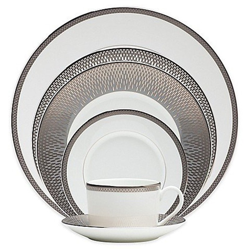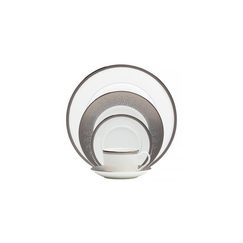 - ''' This Aras 5-Piece Place Setting includes a Dinner Plate, Salad Plate Bread & Butter Plate, Teacup and Saucer for elegant dining and entertaining#||# The design resembles the shimmering droplets of water from Ireland's beautiful lakes and rivers. The crispness of the pure white fine bone china is embellished with an elegant grey and platinum design that varies on each piece#||# The layering of the exquisite droplet boarder creates an interesting and textured framework, sure to impress your guests'''