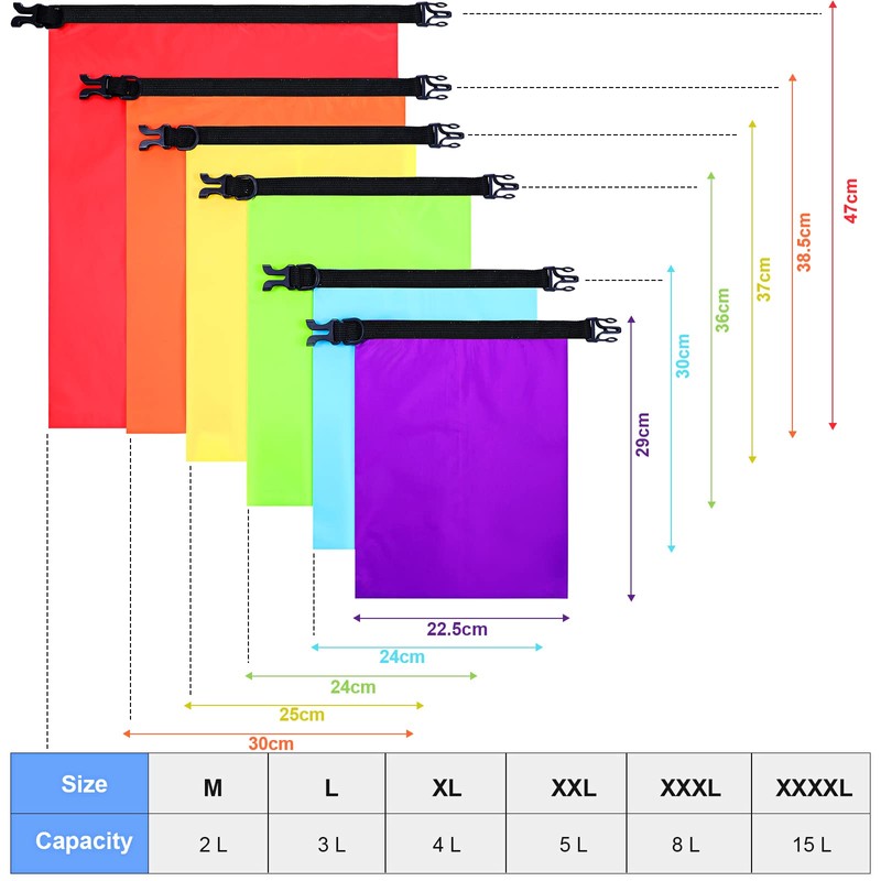 - Ample amount: the package includes 12 pieces of waterproof dry bags, including the capacity of 15 L, 8 L, 5 L, 4 L, 3 L and 2 L, 2 pieces of long adjustable shoulder straps (15 L and 8 L may need to use), different sizes and colors are prepared to satisfy your various needs