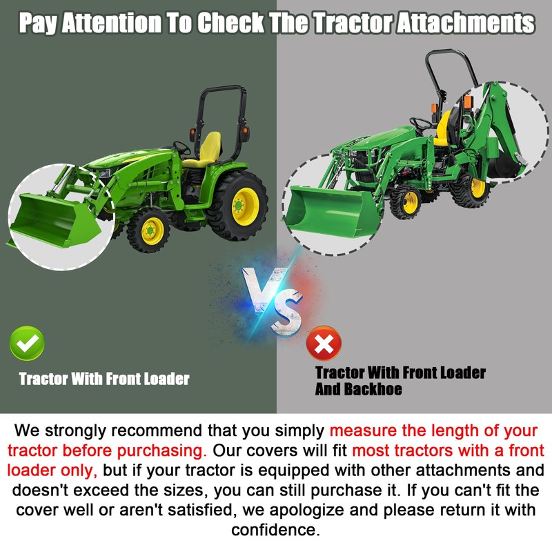 - Universal Fit: This Full Tractors Cover fit most compact utility tractors with front bucket and without Backhoe, Including replacement for John Deere 1 Series, 2 Series and 3 Series(1023,1025R, 2023R, 2025R, 2305, 2320, 2520, 2720, 3120, 3320, 3203, 4105 and etc), New Holland Boomer series, Kubota BX series, and Mahindra Max & Emax, Bobcat, Kioti, Branson, TYM, Massey Ferguson and etc