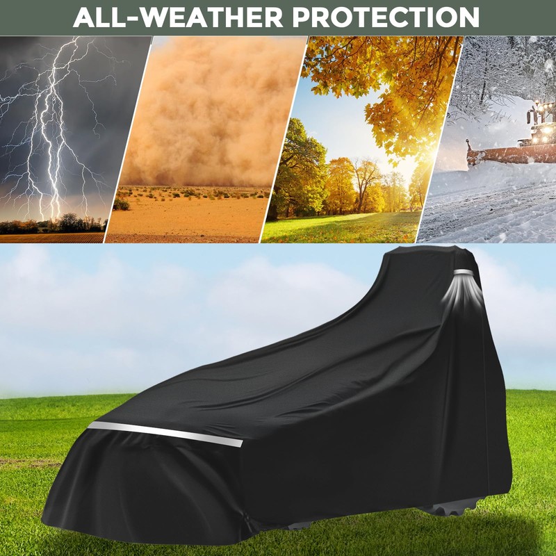 - Heavy Duty Material: This All Weather Lawn Mower Cover made of 600D Oxford Fabric with Inner Black PU Coating, Can withstands summer sun exposure and winter rain/snow (Waterproof pressure up to 4000mm), Inner Black PU Coating is good at sunproof and waterproof, keeps car cool in the sunny day