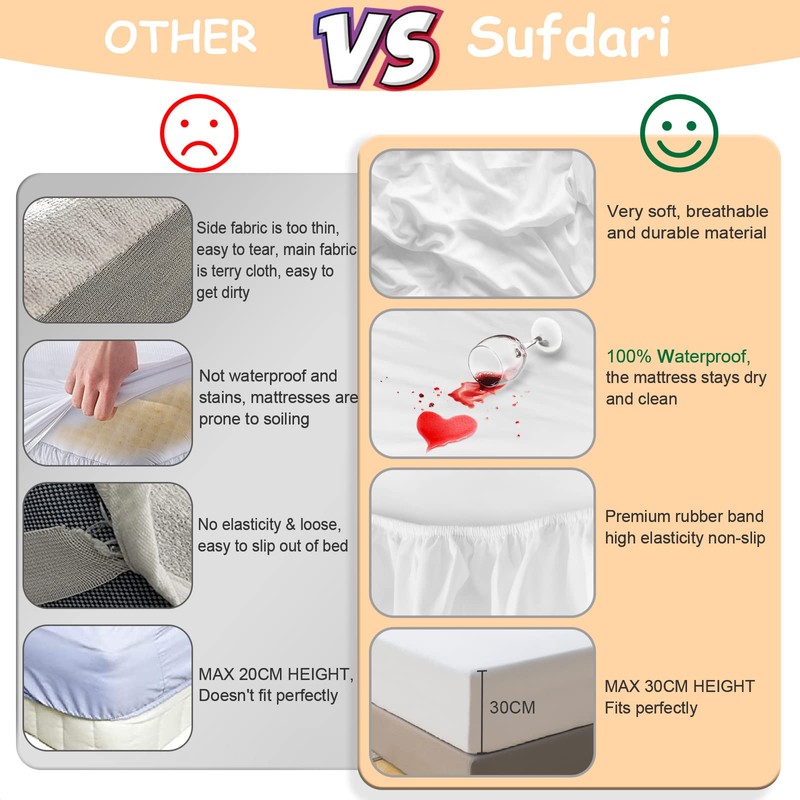 A Sufdari waterproof fitted sheet is a wise investment, it protects the mattress from minor accidents, it is easy to wash and provides a cozy sleeping environment and a child who sleeps well all night is a dream, isn't it?