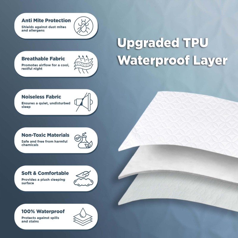 - Waterproof & Bed dust Proof Protection: This mattress protector features an advanced waterproof barrier that protects your mattress from spills, sweat, and other liquids, while also providing a shield against bed dust, dust mites, and allergens. Keep your mattress clean without compromising on comfort.
