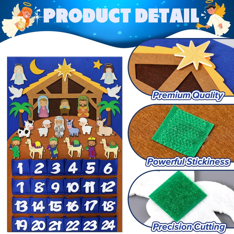 - Countdown to Christmas: you will receive a nativity scene countdown calendar with Jesus nativity theme, with 24 different felt Jesus birth decorations to celebrate the 24 days of Christmas; This decoration will fill you with fun, creativity, and joy