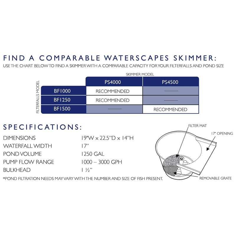 Waterscapes International FilterFalls spillways is available in three convenient sizes. The BF1250 FilterFalls with 17" spillway and 1 1/2" Bulkhead is ideal for small ponds and/or water gardens with a 2,000 - 3,000 GPH pump flow. Each unit includes a FIPT bulkhead fitting, media bag, filter pad, removable bottom grate, liner attachment flange and a lifetime warranty on the enclosure.