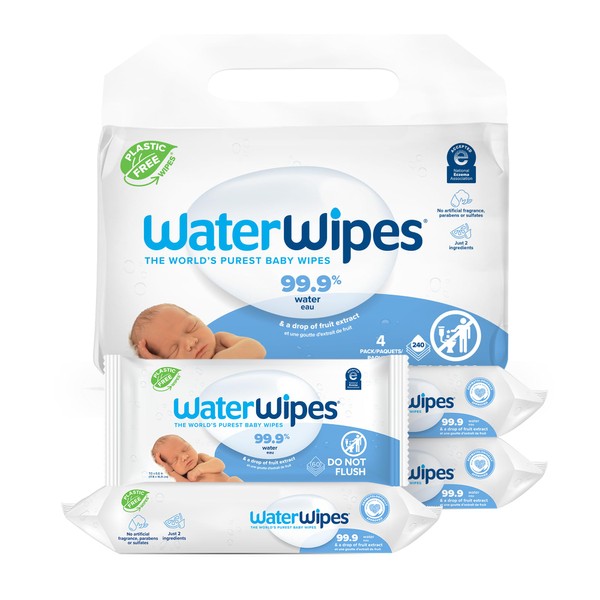 WaterWipes WaterWipes Biodegradable Original Baby Wipes, 99.9% Water Based Wipes, Unscented & Hypoallergenic for Sensitive Skin, 240 Count (4 packs), Packaging May Vary