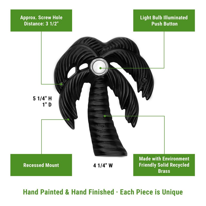 Waterwood Solid Brass Palm Tree Doorbell in Black - Wired & Illuminated Push Button from Environmentally Friendly Recycled Material