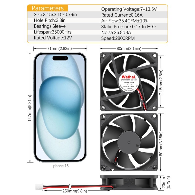 - Compact and Efficient: 80 x 80 x 20 mm (3.15 x 3.15 x 0.79 in.) size with a hole pitch of 71.5 mm (2.8 in.). Rated voltage: 12V DC, Power: 2W, Airflow: 35.4 CFM, Static Pressure: 0.17In H2O, Noise: 26.8dBA, Speed: 2800 RPM