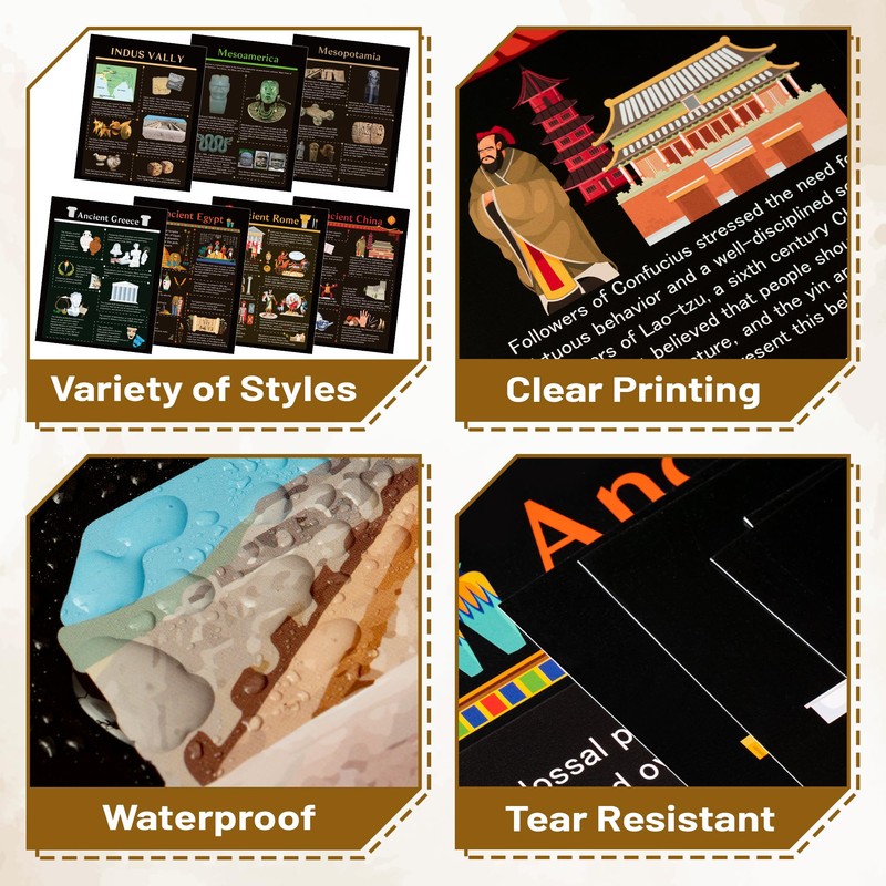 - Exquisite Design -Our learning material posters are printed with ancient artifacts and presentations from 7 countries, including Ancient Egypt, Mesopotamia, Ancient Rome, Ancient Greece, Ancient China, Mesoamerica, Ancient India. They can be great teaching materials for teachers to help students learn and remember more information.