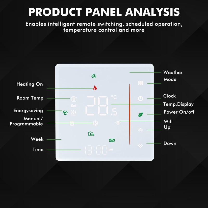 - WiFi smart control: With the "Smart Life" app, you can conveniently control the WiFi thermostat for underfloor heating from your smartphone, tablet or other mobile device and control it on and off, timer and temperature. Thanks to the voice control of Alexa and Google Assistant, the thermostat allows you to have a hands-free, smart lifestyle