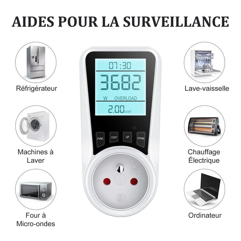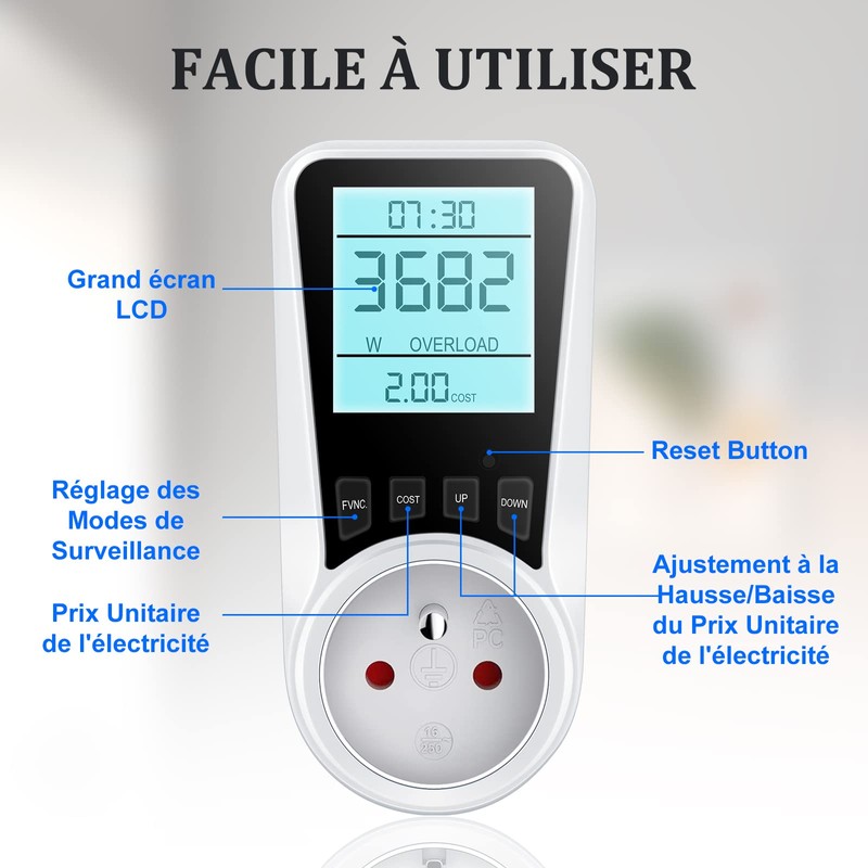 - Easy to use: just press the "FUNC" button to select the monitoring mode, press the "COST" button to adjust the current price, press the "UP" and "DOWN" buttons to set the price per unit for power. The "Reset" button allows you to clear all settings (including the price per item).