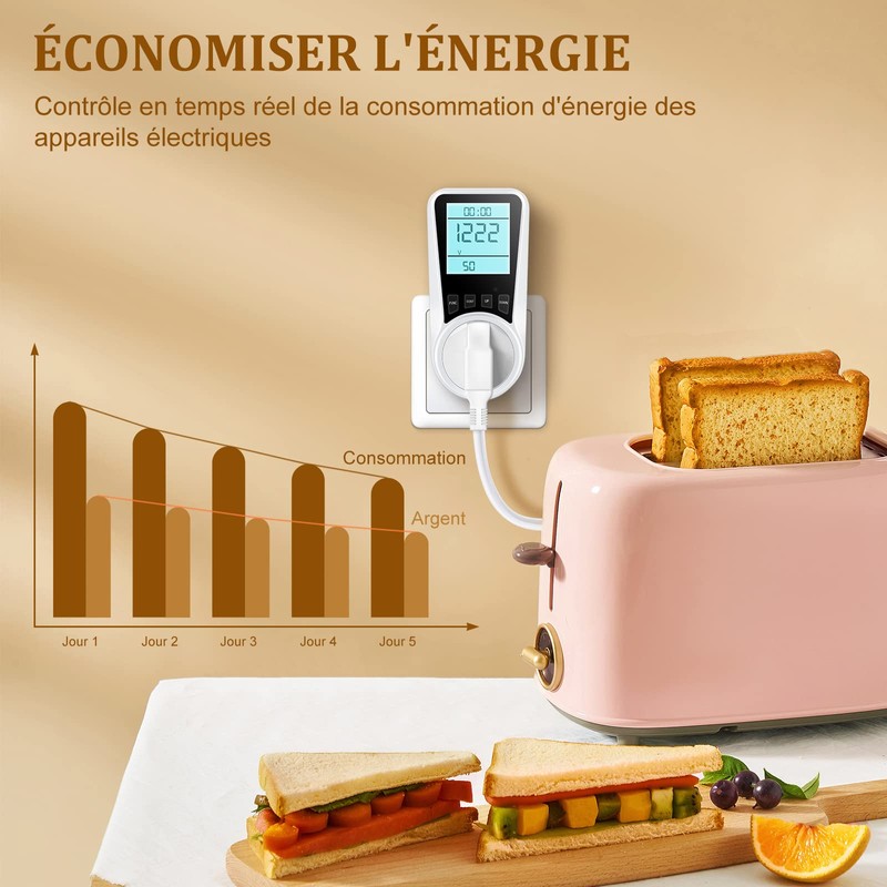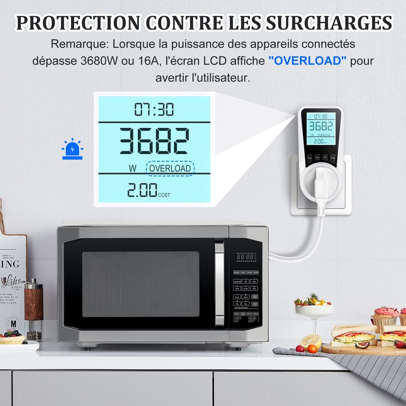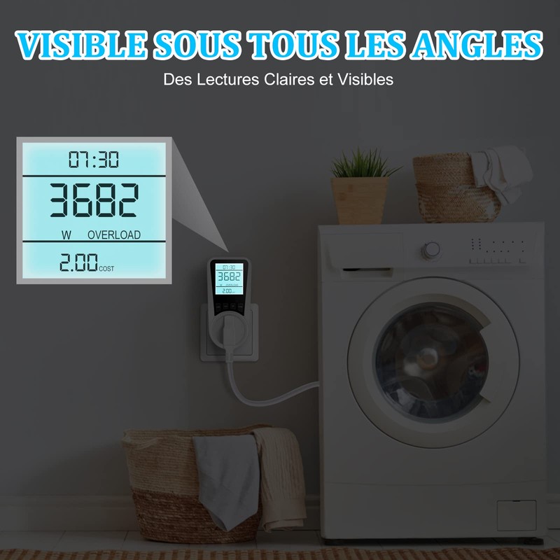 Wattmeter Electricity Meter Energy Consumption with 7 Monitoring Modes LCD Display with Backlight Power Connection for Energy Saving Overload Protection Max 3680W