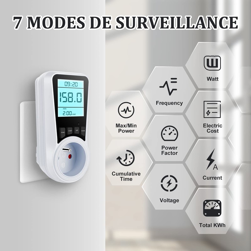 - 7 Monitoring Modes: This electricity meter monitors multiple parameters, including time, cost, energy consumption (kWh), voltage (V), frequency (Hz), current (A), power factor, minimum and maximum power (W), price per piece, which monitors all devices.