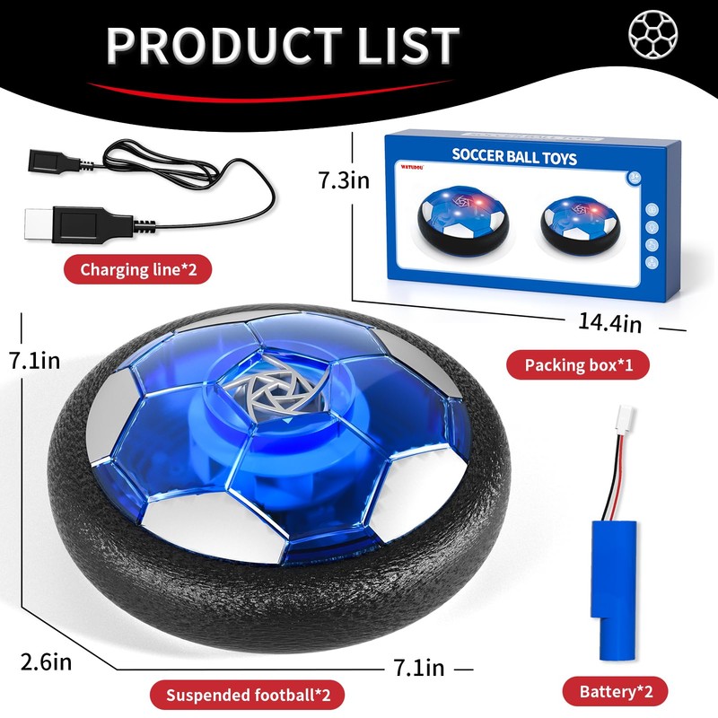 - 2 PCS Hover Soccer Ball Toys for Kids Boys: This soccer balls toys for kids boys, adorned with LED lights, not only adds a visual element to the game play but also amplifies its enjoyment and challenge in dimly lit settings. Furthermore, its levitation technology, powered by robust air flows and motor design, keeps the football afloat and gliding smoothly across the surface, minimizing friction and enhancing the overall fluidity and control of the game. Ideals hover soccer ball sets for boys.