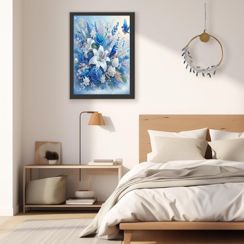 - Home Decor: Decorated with blue birds flower diamonds pictures gem art crafts, your bedroom, living room, study or office can be more colorful and make your staying in these places more enjoyable.