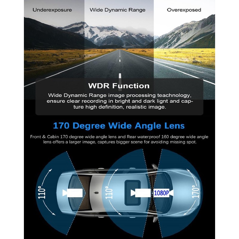 - 【3 Channel Front Inside Rear Dash Cam】: 3 channel camera can record video up to Full UHD (1080P) on the front and 480P on the rear and cabin, Offering a 170° front camera, a 110° built-in camera and rear camera, it can simultaneously monitor the front, rear and interior of the vehicle to maximize road coverage, while providing high quality video at 2.5K that allows you to see a clearer image at any angle without any blurring, record more evidence for insurance disputes.