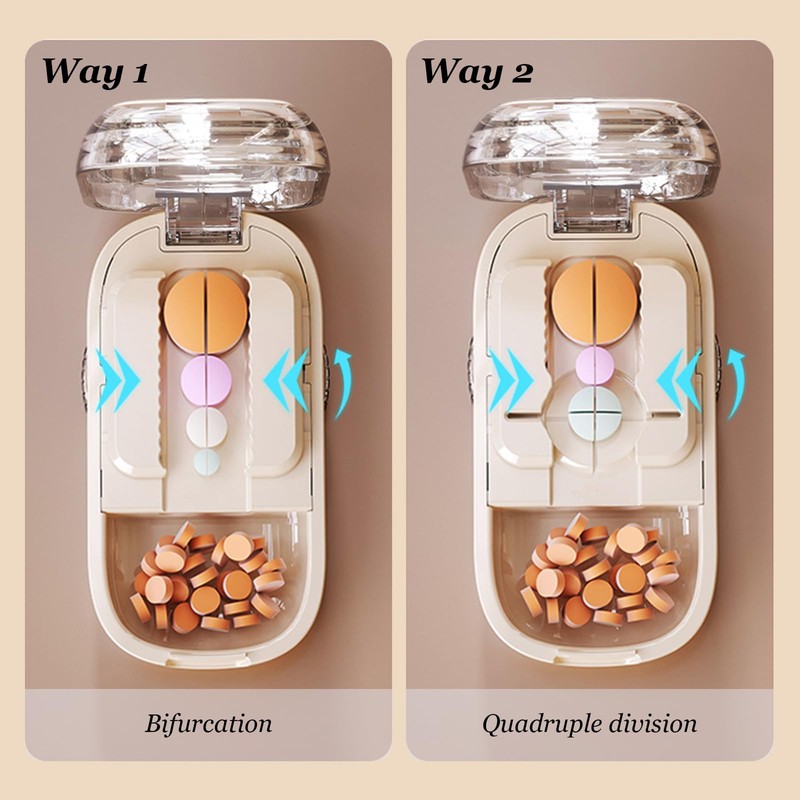 - Multifunctional and practical: our medicine cutter offers an innovative 2 in 1 function: place the tablet at the edge to cut it into two parts, or in the middle to divide it into four parts. The wide bottom section also doubles as a medicine box to conveniently store multiple tablets.