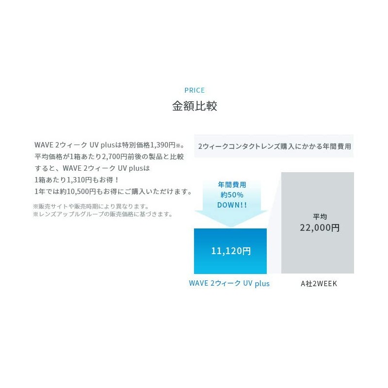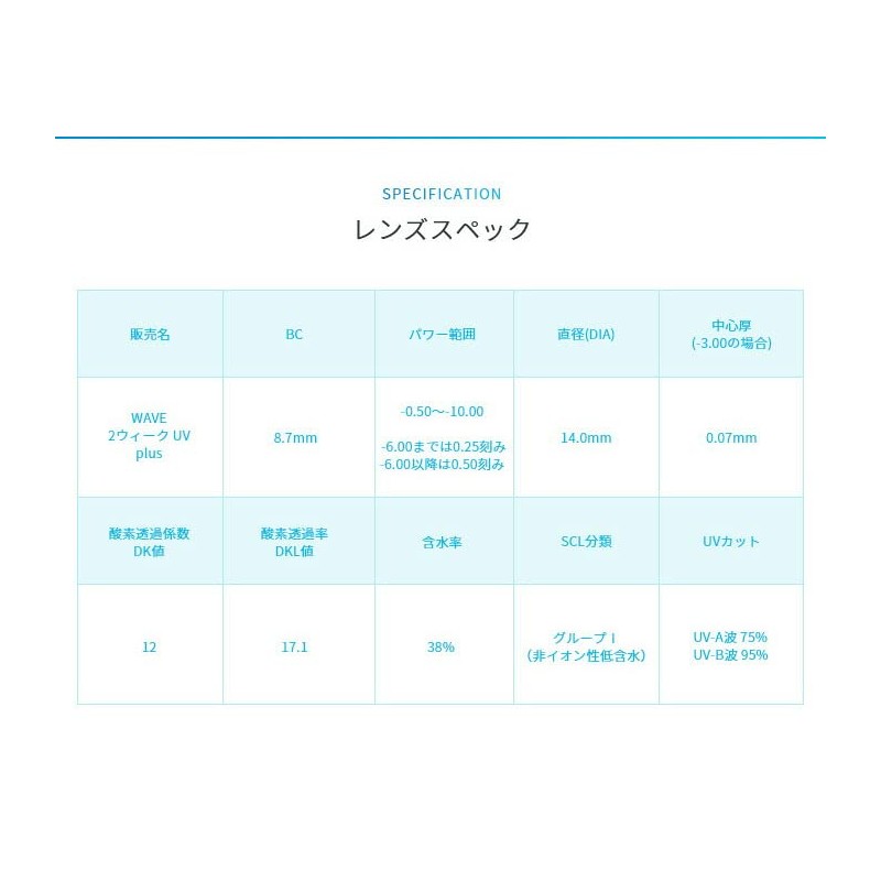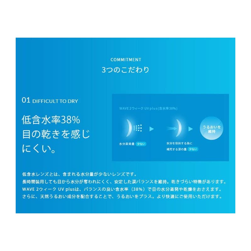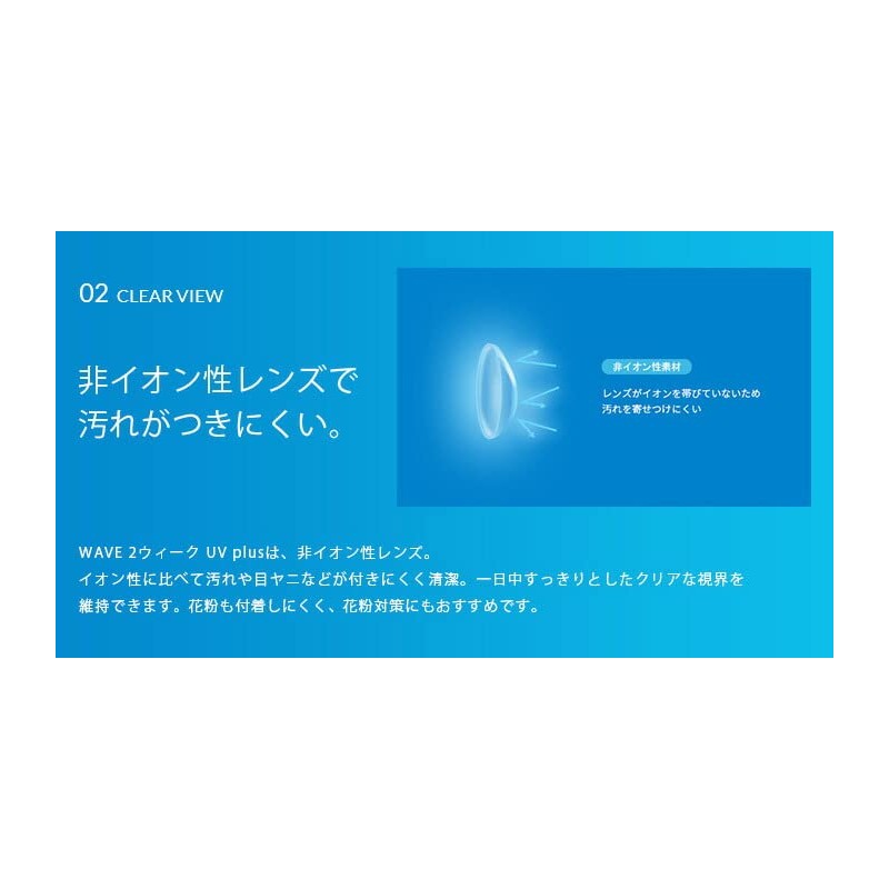 - WAVE2ウィーク UV plusは、潤い成分であるアルギン酸を配合。取り出しやすいBOXにリニューアル。 汚れが付きにくい非イオン性素材を採用。クリーンでクリアな視界が続きます。 また、弾力性のある素材ですので、カタチがくずれにくく、はじめてソフトコンタクトレンズを使う方でも取扱いが簡単です。