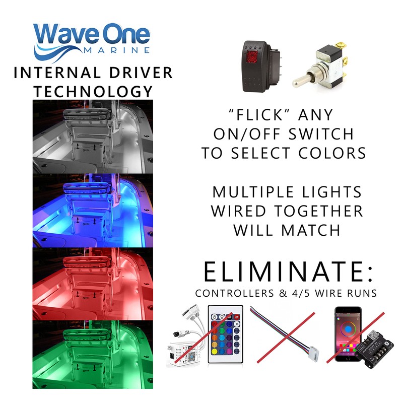 - INTERNAL DRIVER (EASY TO UPGRADE): Others lights use external drivers / apps or 4 / 5 wires creating a need for a additional wiring. Not Ours. Easily upgrade to our four color tech using your existing + / - wire and original switch. Simply "flick" your switch on-off-on to switch colors. Multiple lights can be joined together to match. Popular accent colors include red for preserving night vision or blue for a cool modern effect great for entertaining at the dock.
