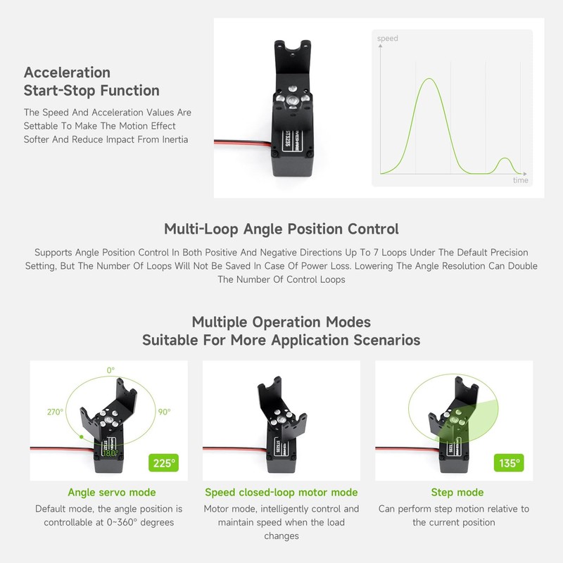 - Acceleration Start-Stop Function-The Speed And Acceleration Values Are Settable To Make The Motion Effect Softer And Reduce Impact From Inertia. One Button To Calibrate The Middle Position-360° Installation At Any Position, One Button To Set The Current Position As Middle Position. Easy To Install And Debug