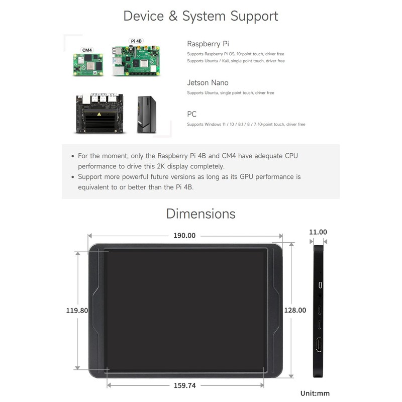 - For the moment, only the Raspberry Pi 4B and CM4 have adequate CPU performance to drive this 2K display completely.