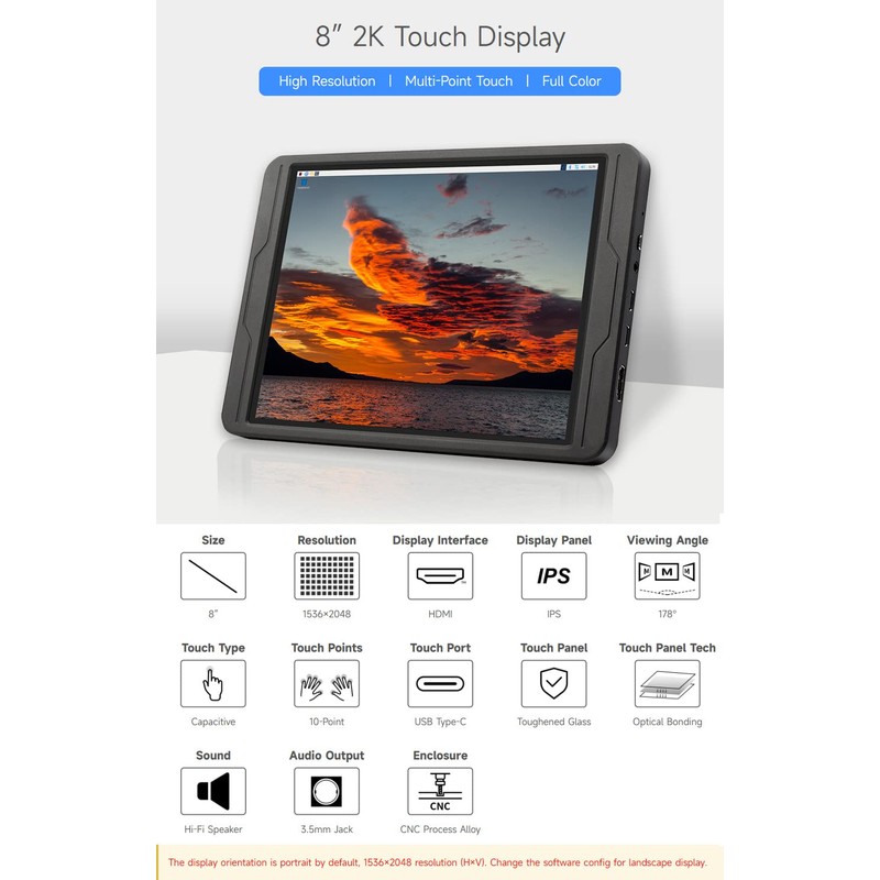 waveshare 8inch 2K Capacitive Touch Display, Compatible with Raspberry Pi 5/ 4B and CM4, 1536×2048, IPS, High Compatibility