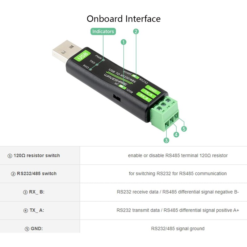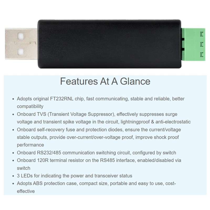 - USB TO RS232/485 es un convertidor de puerto serie no aislado USB a RS232/485, con el FT232RNL original para una mayor estabilidad y compatibilidad. Viene con un fusible de autorrecuperación integrado, circuito de protección de TVS, etc. USB TO RS232/485 ofrece un funcionamiento simple, transmisión automática de retardo cero y conversión de recepción, y cuenta con características como comunicación rápida, estable, fiable y segura.