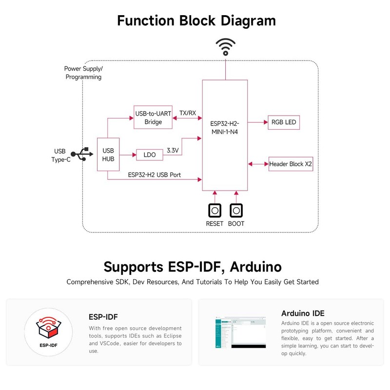 - ESP32-H2-DEV-KIT-N4 with pre-soldered header. Adopts ESP32-H2-MINI-1-N4 module with RISC-V 32-bit single-core processor, up to 96MHz main frequency, built-in 4MB Flash